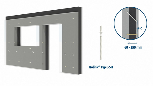 Thermoanker with depth limiter for thermal breaks between core-insulated element and sandwich walls manufactured at a prefabricating plant, for suspended architectural concrete façades.