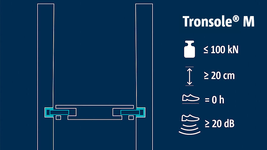 Tragendes Trittschalldämmelement für den Anschluss Treppenpodest an Treppenhauswand. Das Element überträgt hohe positive und negative Querkräfte. Ein Element mit Lastaufnahmerichtung VH+VH überträgt zusätzlich seitliche Horizontalkräfte.