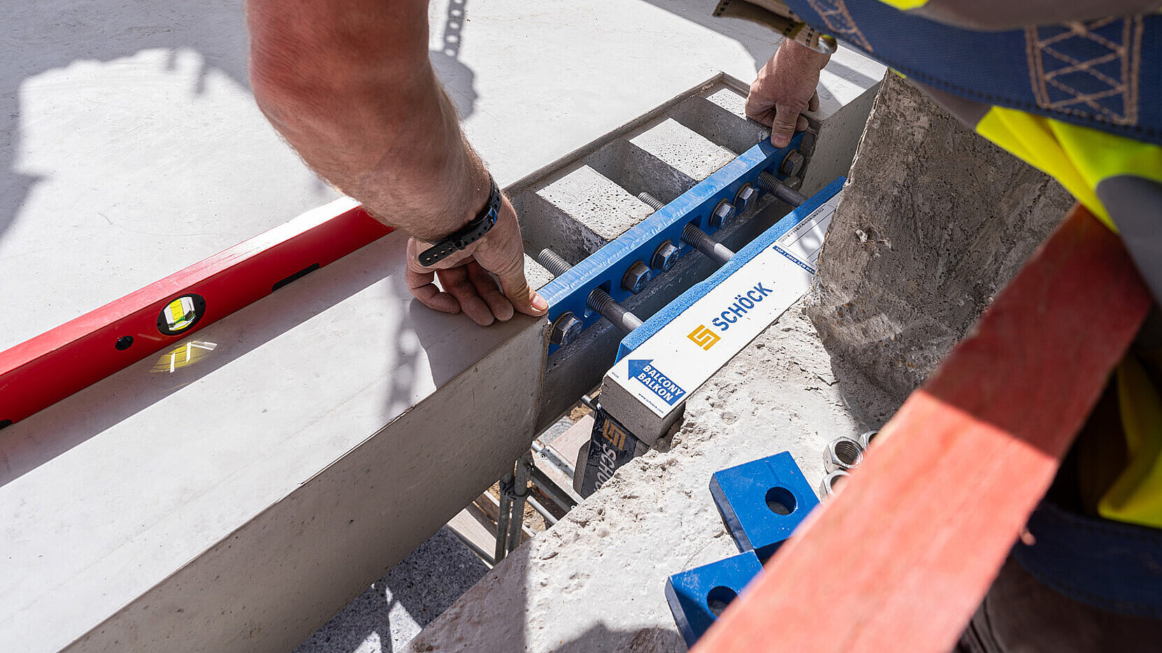 Für das schnelle, bauzeitenflexible und wirtschaftliche Bauen bietet Schöck intelligente und kundenorientierte Lösungen für den wirtschaftlichen Anschluss vorgefertigter Bauteile ans Gebäude – wie beispielsweise die Neuheit Schöck Isokorb® IQ K. Das neue tragende Wärmedämmelement macht die bauzeitenflexible Montage zur Realität. Erfolgreiche Testläufe zeigen das Potenzial dieser wegweisenden Entwicklung für den modernen Geschosswohnungsbau. Frei auskragende Stahlbetonbalkone können nachträglich einfach per Kran eingehoben werden und sind in Minutenschnelle montiert.