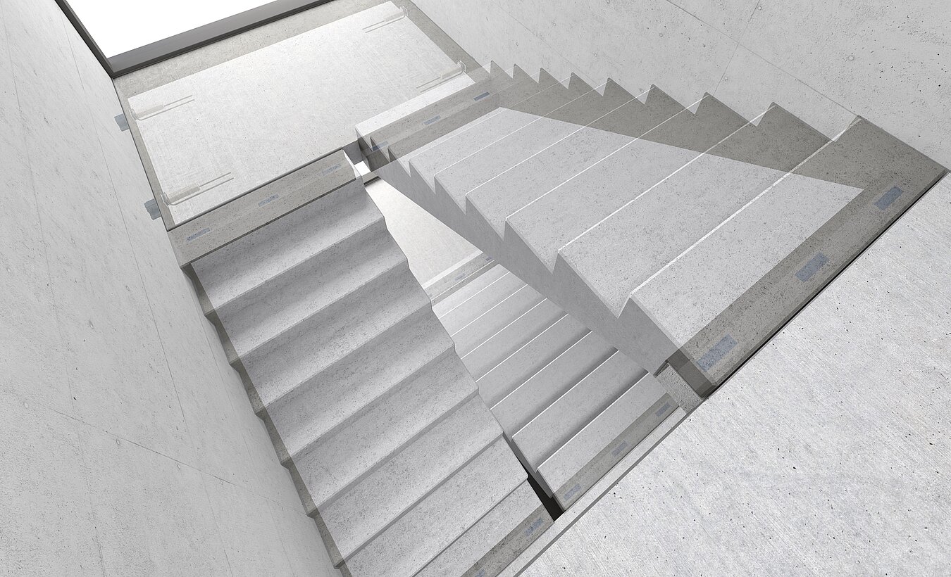 Entkopplung des Treppenlaufs zum Podest durch Schöck Tronsole® BZ und zur Bodenplatte durch Tronsole® B. Entkopplung des Podests zur Wand durch die Tronsole® P. Der Treppenlauf wird zur Wand mit der Tronsole® L schallgedämmt.