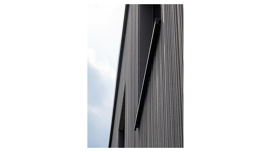Die notwendige Büroerweiterung nach dem Entwurf des Architektur- und Planungsbüros Schildgen aus Herne nutzte Reckli, um die Wirkung von attraktiven Oberflächenstrukturen am eigenen Neubau zu präsentieren. Während sich das Erdgeschoss mit seiner Glasfassade bewusst unterordnet, dominiert die Sichtbetonfassade der oberen Etage die Optik des zweistöckigen Gebäudes. Das in dunklem Anthrazit eingefärbte, vertikal verlaufende Wellenprofil besticht mit auffälligen, dreidimensionalen Effekten, die aus der ausgeprägten Tiefenstruktur resultieren. Hinter dem ästhetisch sowie bautechnisch perfekten Ergebnis stehen drei Unternehmen: der Bauherr Reckli in seiner Funktion als Hersteller von Strukturmatrizen, das mit der Produktion der Sandwichelemente beauftragte Fertigteilwerk Hering Architectural Concrete sowie der Bauproduktehersteller Schöck mit seinem innovativen Fassadenanker Schöck Isolink.
