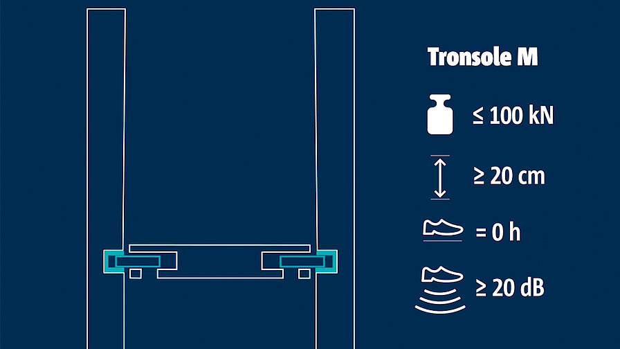 Mit Tronsole M können Lasten von bis zu 100 kN aufgenommen werden. Sicherheit bei der Planung und Ausführung verschafft die bauaufsichtliche Zulassung durch das DIBt. Den effizienten Trittschallschutz gewährleistet die schalltechnische Prüfung nach DIN 7396.