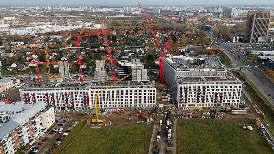 Auf einem 39.400 Quadratmeter großen, ehemals brachliegenden Gelände im Berliner Stadtbezirk Friedrichshain-Kreuzberg entsteht im Auftrag der landeseigenen Berliner Wohnungsbaugesellschaft Gewobag ein neues Wohnviertel. Das Ensemble mit vier großen, sieben- bis achtgeschossigen Gebäudeteilen soll erschwinglichen Wohnraum für kleine und mittlere Einkommen sowie Studenten schaffen. Ein Großteil der 1.548 Wohneinheiten, vom Einzimmerappartement bis zur 5-Zimmer-Wohnung, ist gefördert und somit belegungsgebunden. Der Entwurf stammt von klare-Architektur, Berlin. Zahlreiche Balkone sowie ein als Parkanlage gestalteter Außenbereich von 6.800 Quadratmetern sorgen für eine hohe Lebensqualität. Diese gewinnt durch die Einbettung in ein gewachsenes Quartier eine attraktive Infrastruktur im Umfeld sowie durch eine gute Anbindung an die Innenstadt.