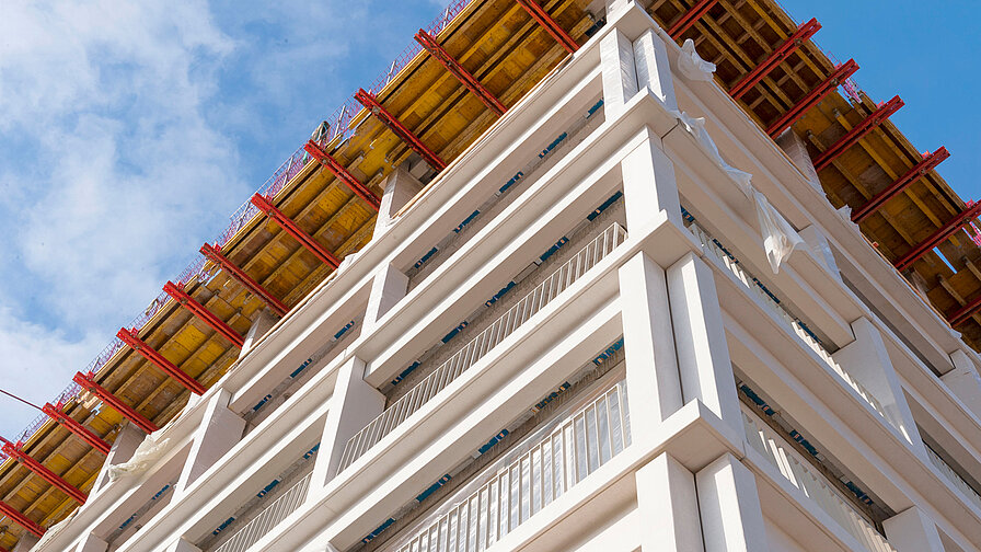 Eine Kletterschalung kennen viele: Etage für Etage wächst das Hochhaus. Doch am Ende steht erstmal nur der Rohbau. Die Fassade kommt meist ganz zum Schluss. Anders lief es beim Neubau des Parkhotels Heilbronn. Berthold Architekten BDA nutzten für die gedämmten Fassadenelemente eine außergewöhnliche wie effiziente Lösung. Die Gesimse aus weißen Betonfertigteilen sind mit den tragenden Wärmedämmelementen Schöck Isokorb für auskragende Bauteile befestigt und thermisch getrennt. Der Rohbau konnte so unter anderem ohne Gerüst und in sehr kurzer Zeit errichtet werden.