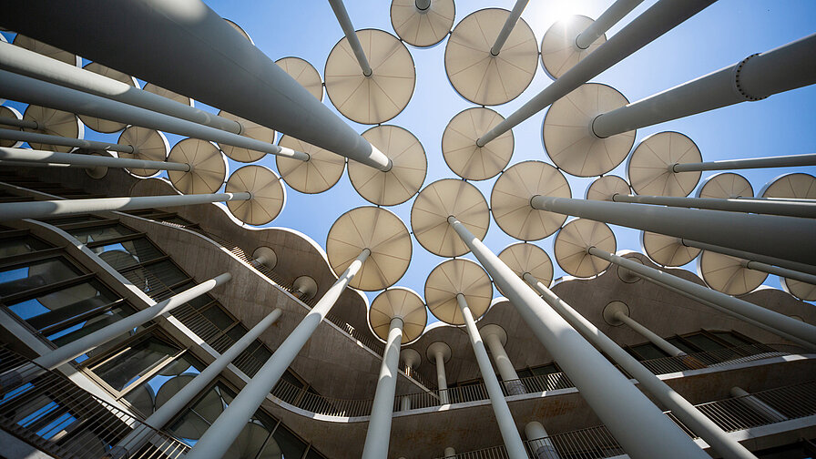 Jede Etage ziert eine Gesimsverblendung aus Weißbeton auf einer Gesamtlänge von einem Kilometer. Die einzelnen Elemente der Gesimsbänder sind mit einem tragenden Wärmedämmelement für auskragende Bauteile, dem Schöck Isokorb, an die Geschossdecken angeschlossen. „Der 21 Meter hohe vertikale Säulenwald lehnt sich horizontal an das Gebäude an, dadurch konnten die Geschossdecken nicht wirklich auskragen. Sie erscheinen durch ihre Betonfarbigkeit so, als würden sie von außen nach innen und umgekehrt durchlaufen“, beschreibt Heidrun Schuhmann die optische Wirkung.