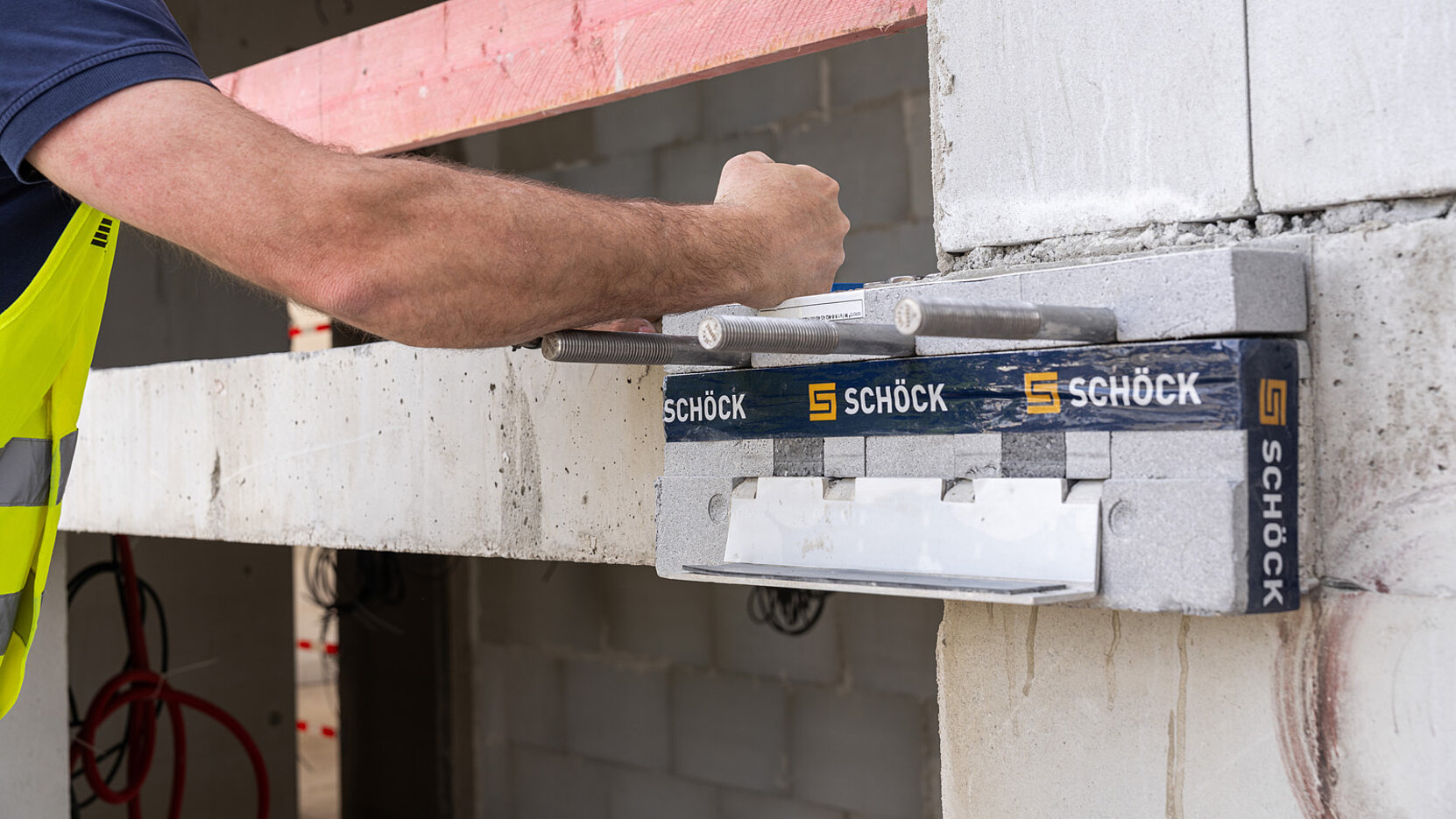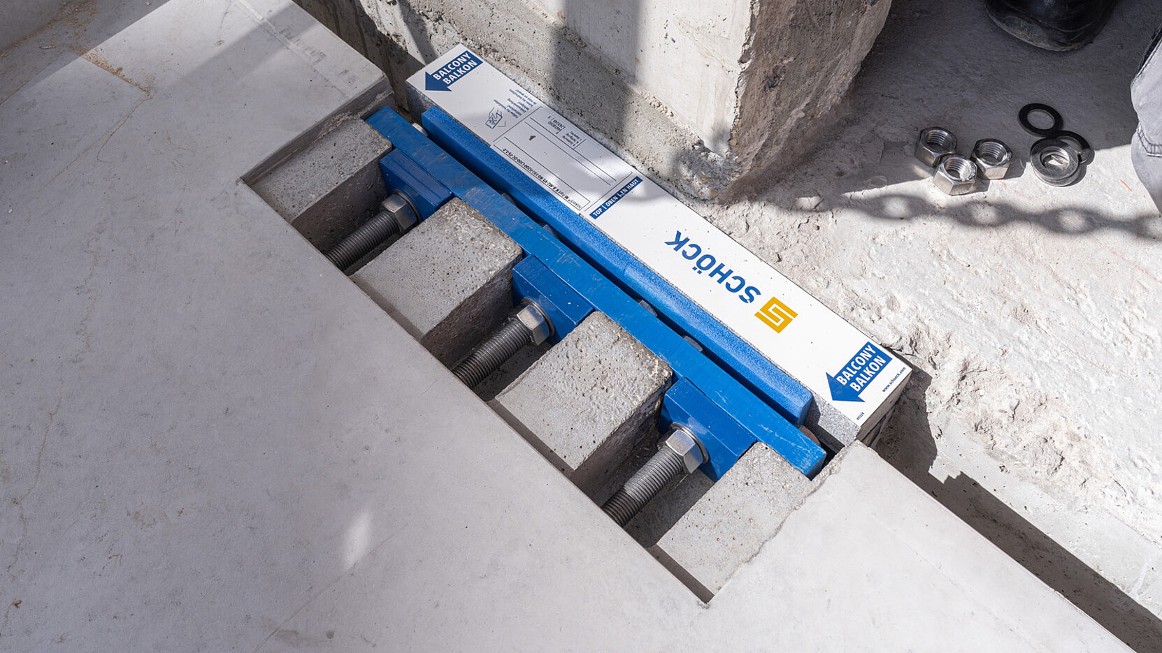 Bevor der Balkon angeschlossen wird, muss der Dämmkörper von Schöck Isokorb IQ K an der Geschossdecke angebracht werden.