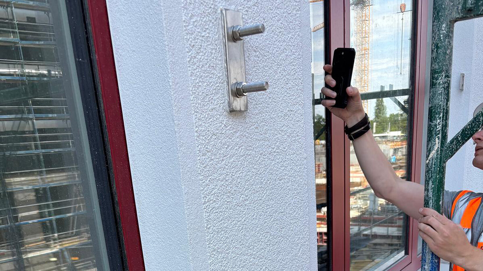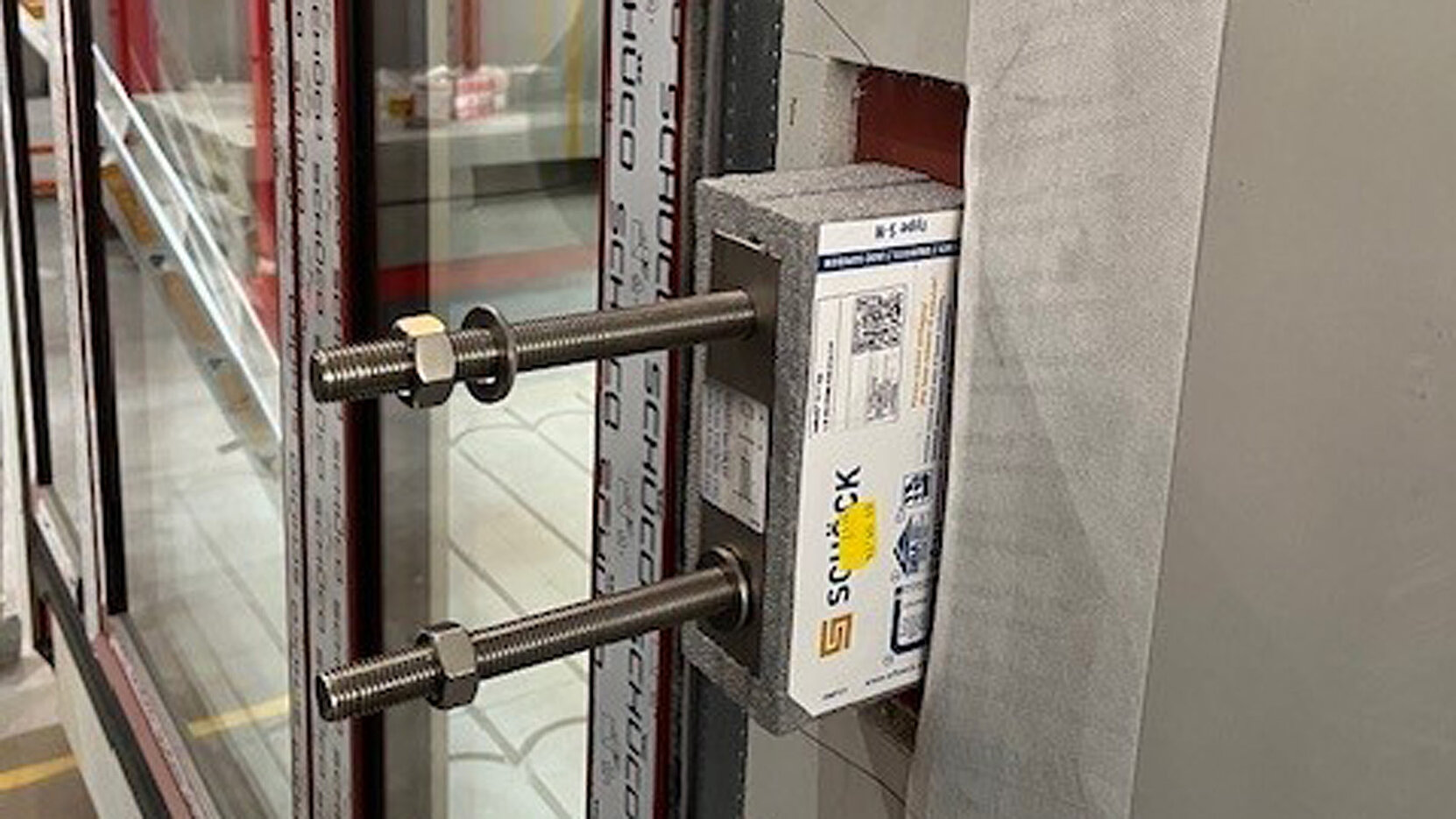 Aufgrund des Fassadenaufbaus war eine Sonderlösung erforderlich: Verlängerte Gewindestangen und ein Adapterbauteil überbrücken die größere Distanz zur Tragstruktur, ohne die statische Sicherheit zu beeinträchtigen. Die flexible Systemlösung erfüllte alle Anforderungen und ließ sich reibungslos in Planung, Vorfertigung und Montage integrieren.