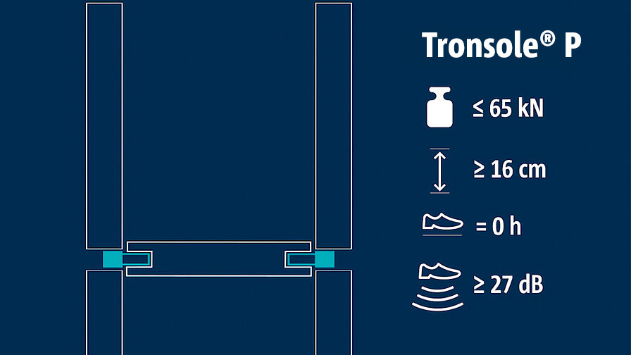 Tragendes Trittschalldämmelement für den Anschluss Treppenpodest an Treppenhauswand. Das Element überträgt hohe positive und negative Querkräfte. Ein Element mit Lastaufnahmerichtung VH+VH überträgt zusätzlich seitliche Horizontalkräfte.