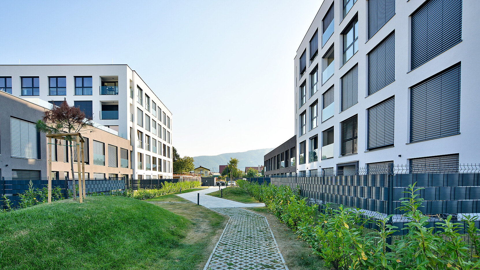 Sodobna soseska v mirni okolici, z zaprto zasnovo in enim vhodom ter premišljeno umeščenimi stavbami. Stavbe so oblikovane v ležečo črko L, z dvonadstropnim nižjim delom in stolpičem s štirimi nadstropji.